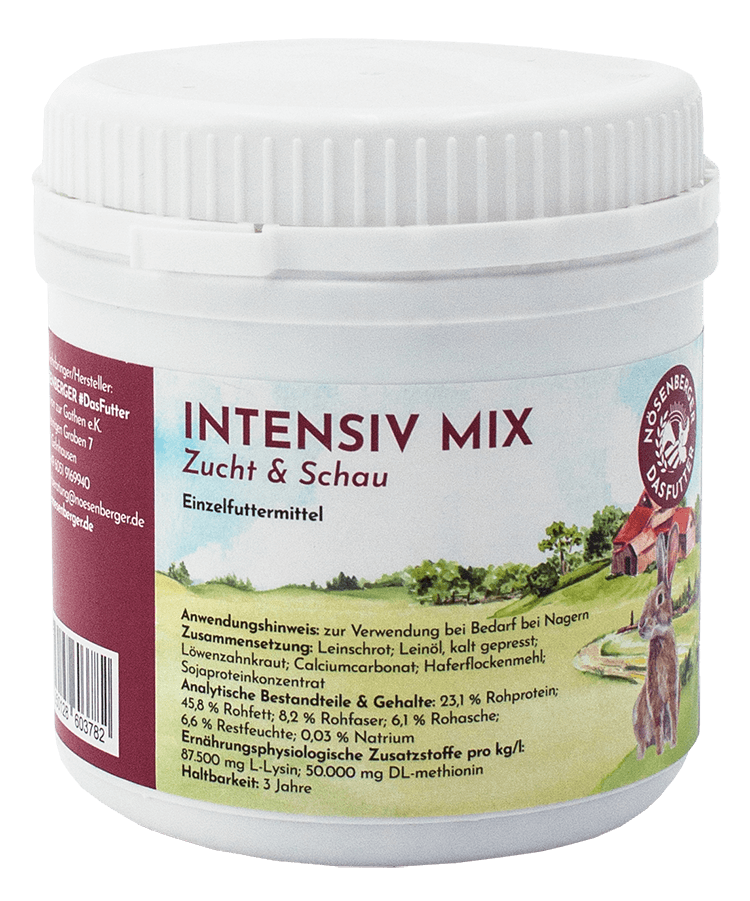Der Intensiv Mix wurde speziell dafür entwickelt, das Nösenberger Natur-Struktur-Müsli sinnvoll zu ergänzen und auf besondere Fütterungsphasen abzustimmen. Durch seine Zusammensetzung eignet er sich sowohl für säugende Häsinnen als auch für heranwachsende Jungtiere ab der 16. Lebenswoche (bei Riesenkaninchen ab der 20. Lebenswoche).
